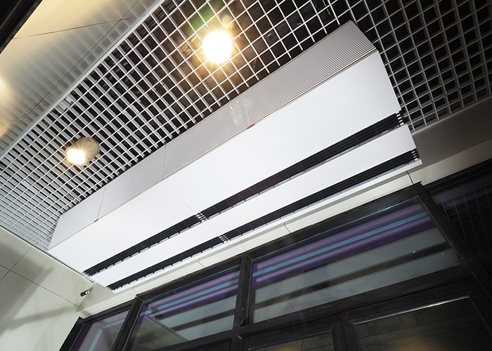 CPSKLR-M型明装双气流顶吹式冷暖风幕,采用空气幕和冷暖风幕组合,一次空气幕气流先拦截室外空气侵入,冷暖风幕气流二次拦截室外空气进入并补充室内冷量或热量,有效封堵建筑开口,阻隔室外强冷热空气侵入更有效,减少室内温度损失,节能高效降低冷热负荷,保持大空间建筑环境温度平衡。本产品具有体积小、风量大、噪声低、运行稳定、封门保温效果显著,空气幕和冷暖风幕可独立控制运行等优点。