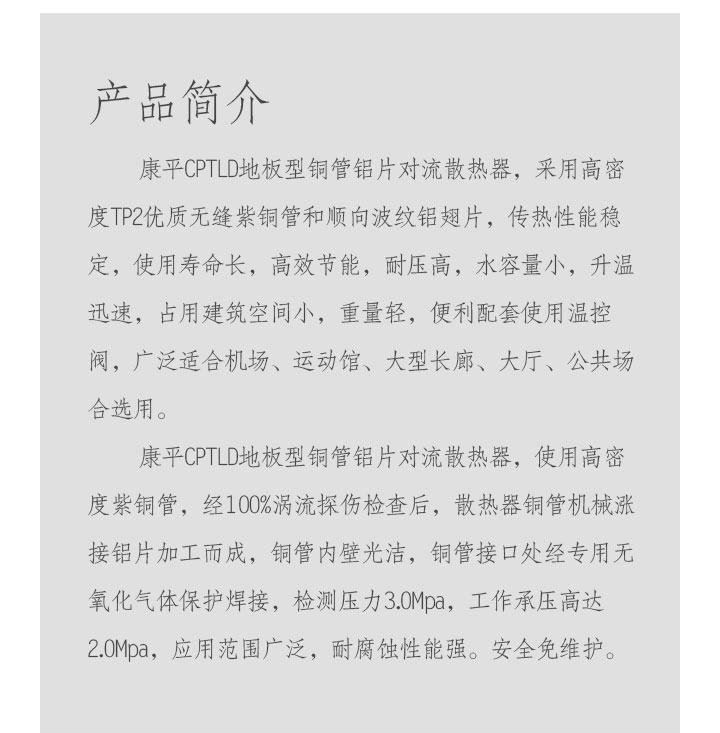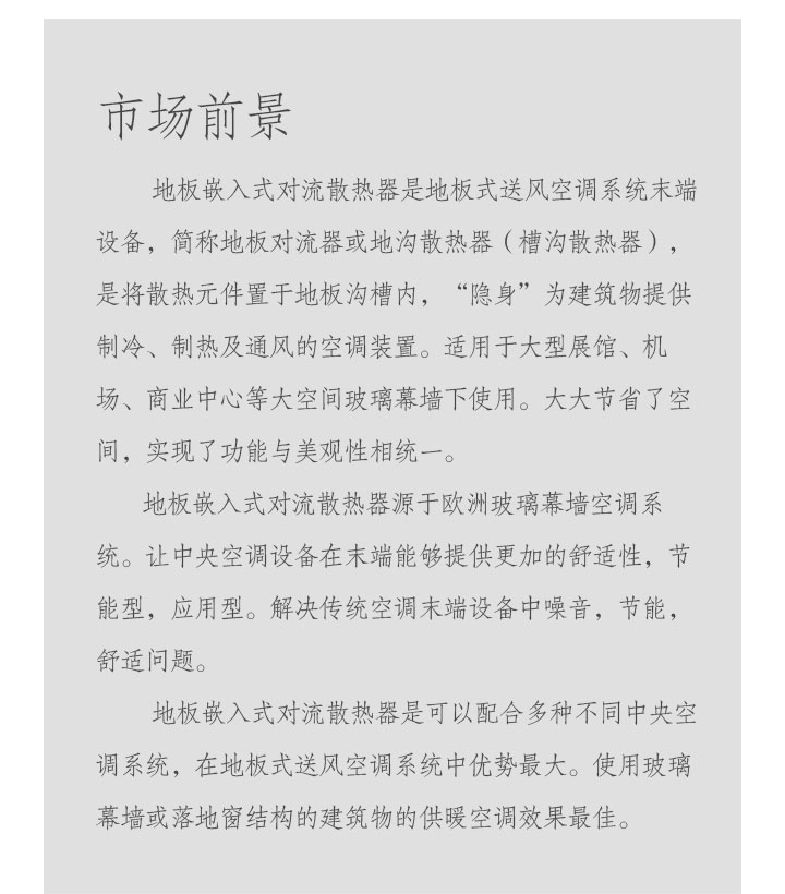 地板嵌入式对流散热器是地板式送风空调系统末端设备,简称地板对流器或地沟散热器(槽沟散热器),