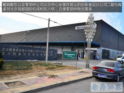 戴姆勒东北亚零部件贸易服务有限公司北京零部件物流中心选址在创新食品分公司二期仓库,比邻首都机场和东六环,方便零部件物流配送,主要服务北区客户。目前戴姆勒东北亚零部件公司执行最高的一天两单机制,北京、上海、广州等大城市奔驰经销商上午下单,最快下午就能送达,最大限度的减轻经销商库存压力。
