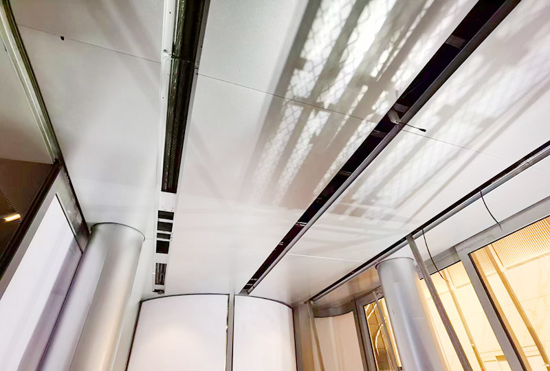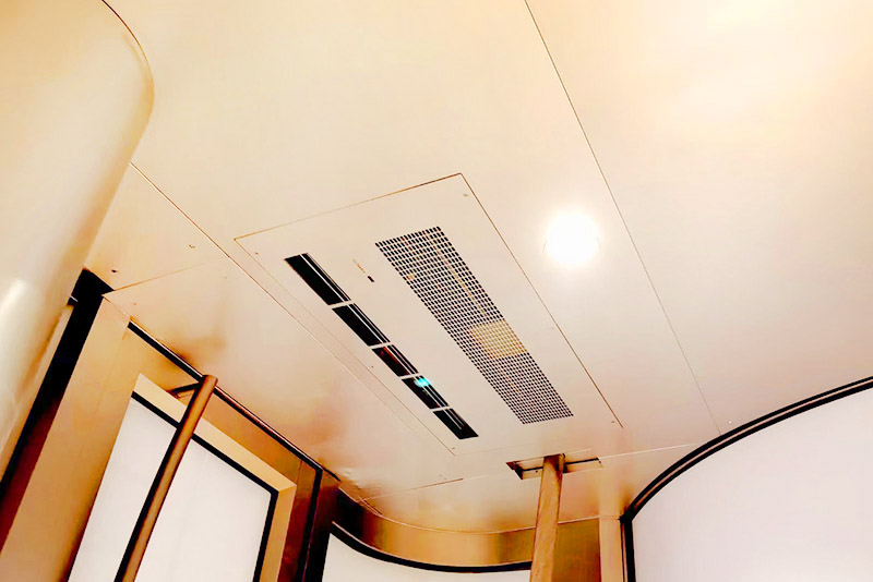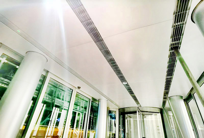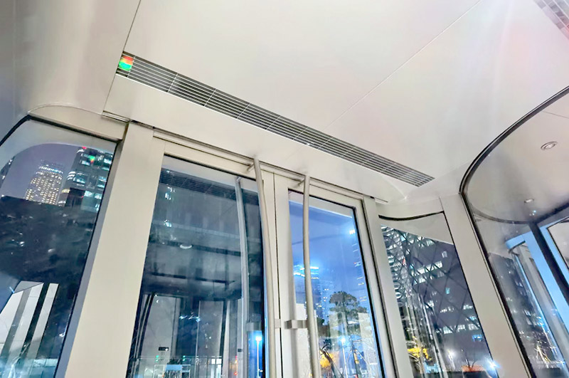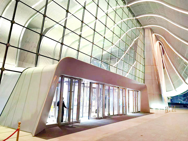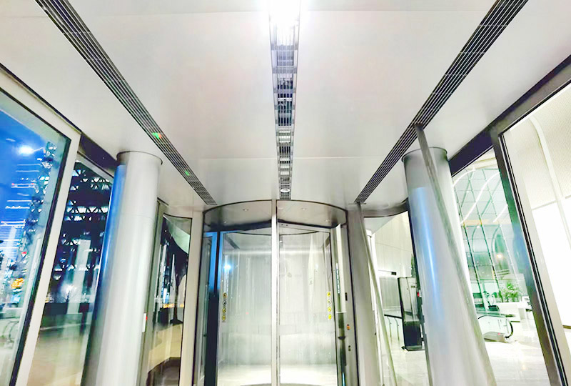 项目简介:中国尊-中信大厦门厅入口原电热电幕、装饰吊顶全面升级,康平全定制模块化电热空气幕系统,综合大风量、微孔消声、智能温度控制、整体建筑装饰设计制造,