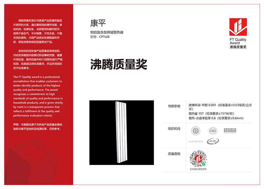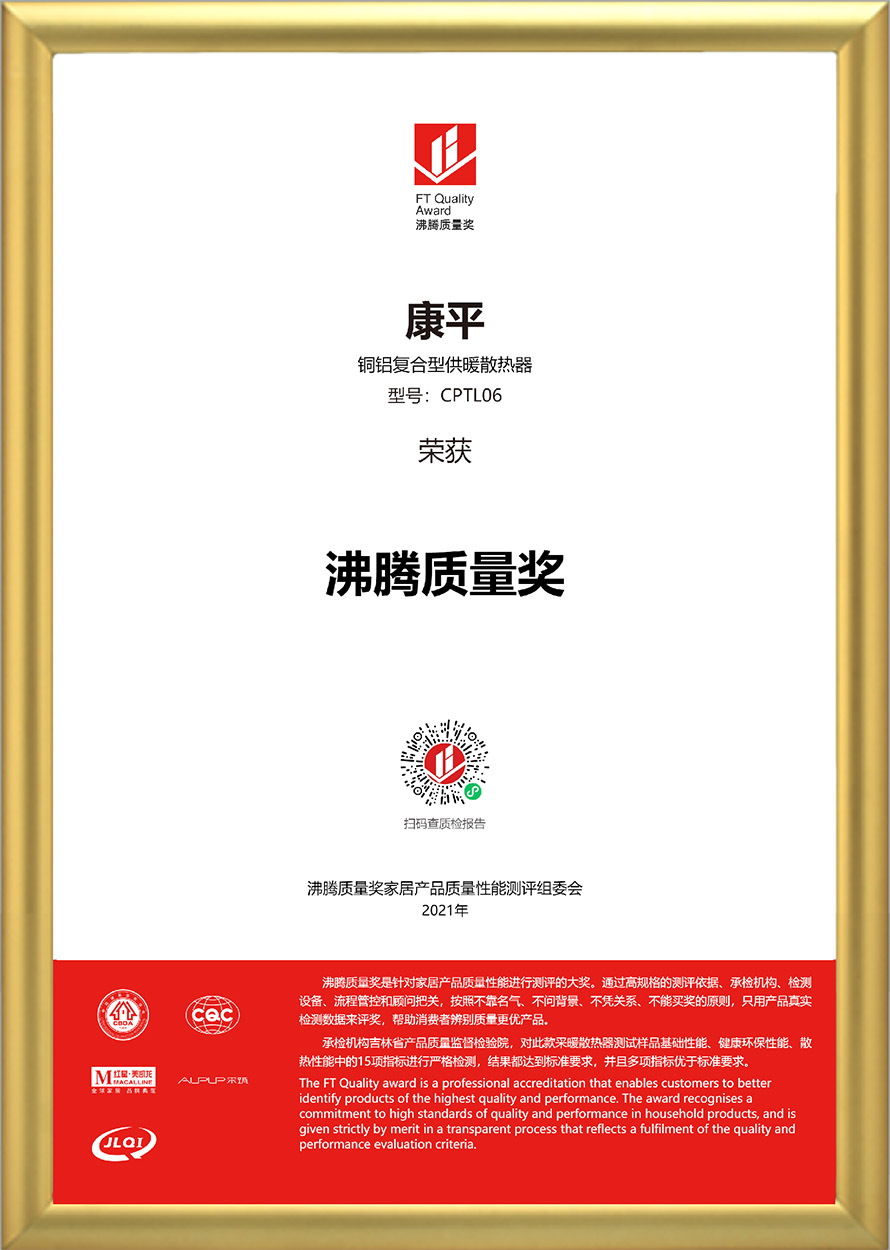 康平铜铝复合散热器产品荣获沸腾质量奖。同时,也进入沸腾质量金奖的评定范围内。